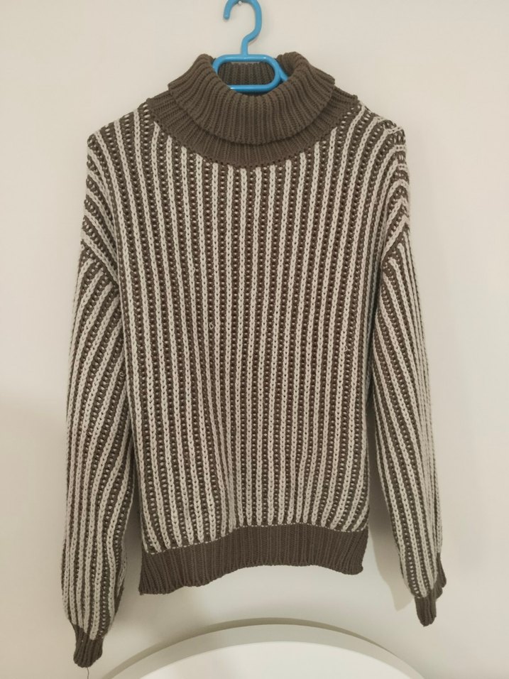 Kadınlar için örme dokulu, boğazlı ve uzun kollu kahverengi-gri çizgili, rahat kesim triko kazak. Günlük kullanıma uygundur.