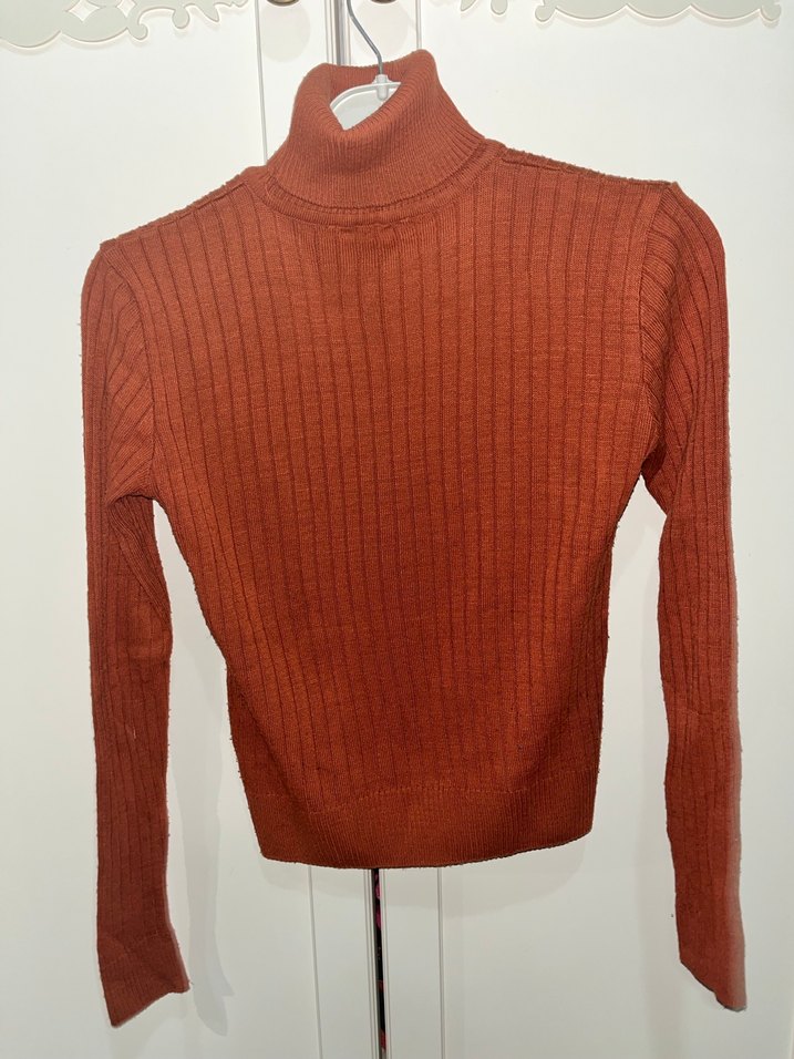 Kahverengi, boğazlı, uzun kollu, triko örme, yün kazak, rahat ve şık günlük kullanım için uygun.