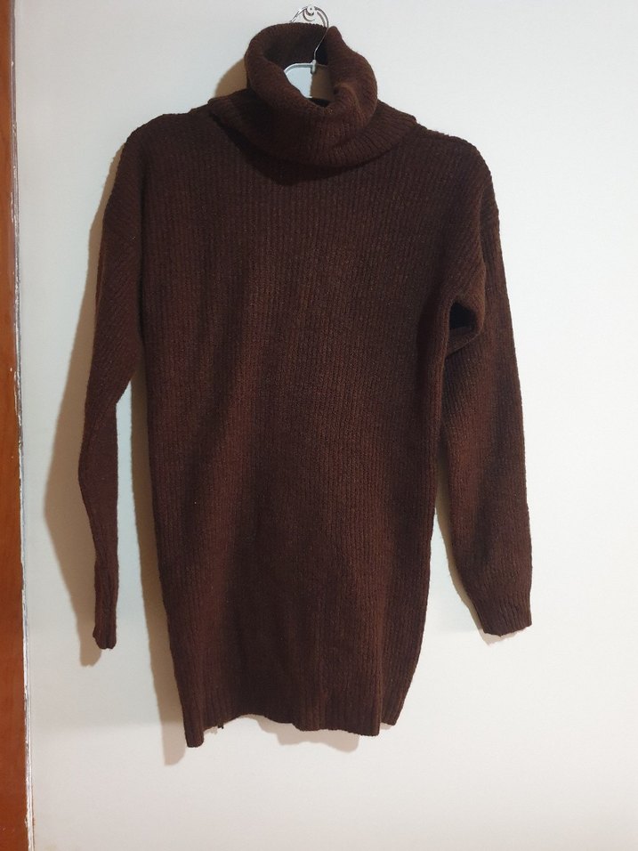 Kahverengi, yumuşak yünden örülmüş, boğazlı, uzun kollu, vücuda oturan midi uzunlukta kadın kazak. Günlük kullanım için uygundur.