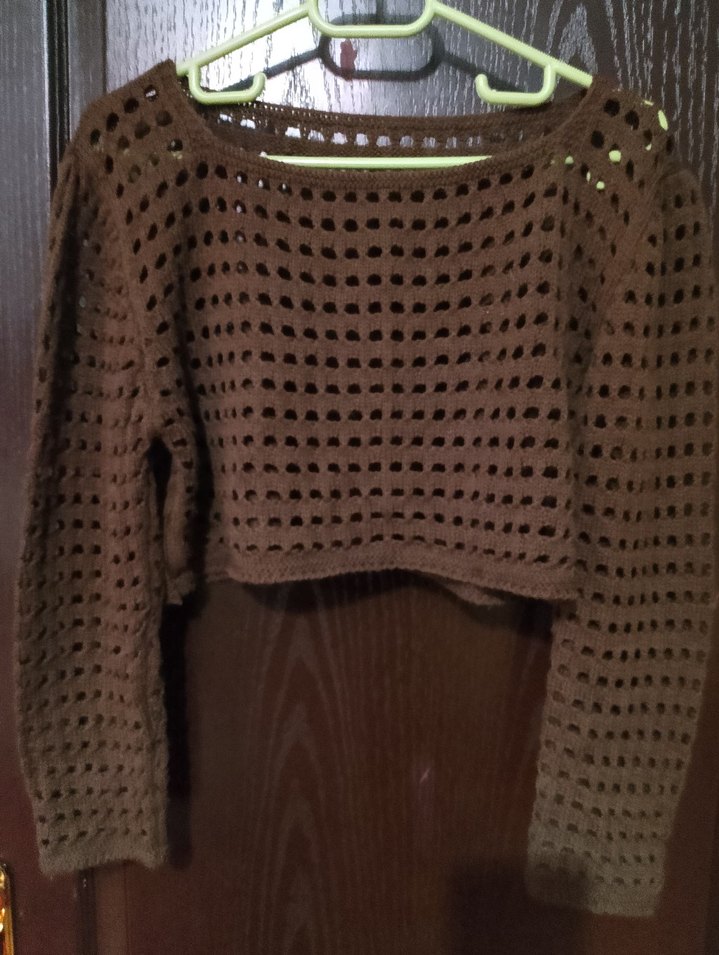 Kadınlar için uzun kollu, yuvarlak yaka, gevşek kesim kahverengi örgü kazak. Bohem ve retro tarzda, günlük kullanım için uygun.