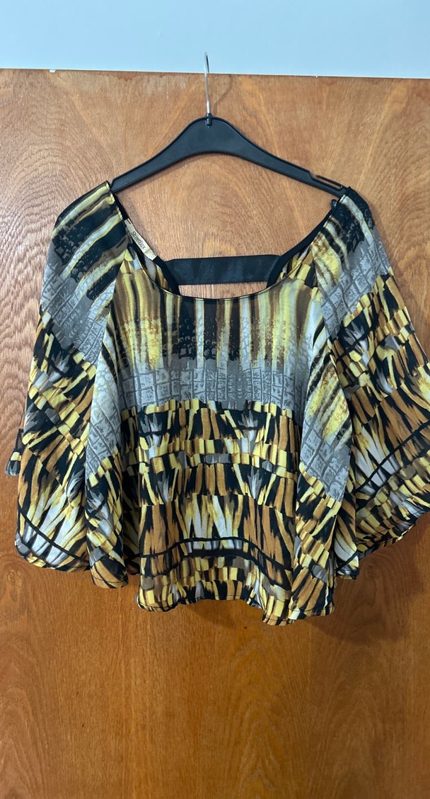 Kadın kahverengi bluz, kayık yaka ve kısa kollu. Bol, pilili kesimi ve koyu batik deseniyle bohem tarzını yansıtıyor.