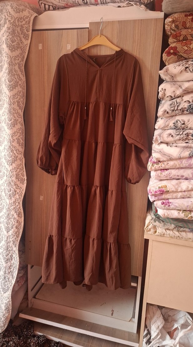 Kadınlar için uzun, bol kesim, fırfırlı, uzun kollu keten elbise. Yüksek yakalı ve koyu kahverengi renkte, bohem tarzına uygun.
