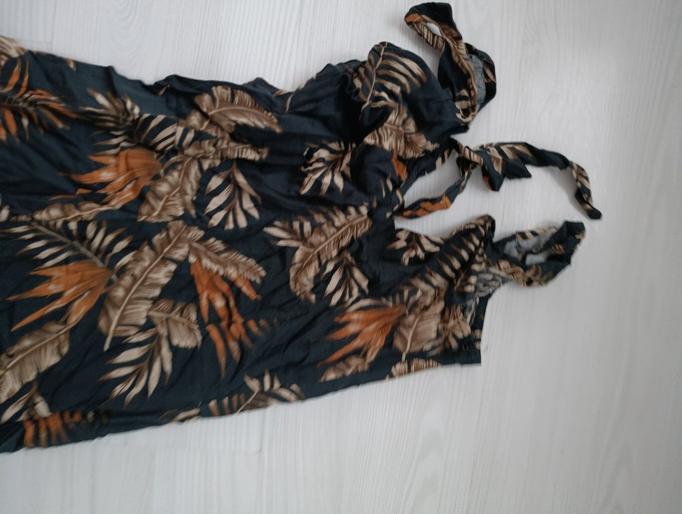 Kadınlar için bol kesim, drapeli ve halter yakalı uzun kahverengi batik desenli tulum. Askılı kollarıyla bohem ve retro tarzını yansıtır.