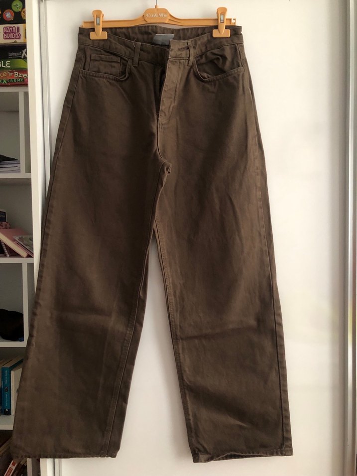 Kahverengi, bol kesim keten pantolon, normal midi boyda, desensiz ve rahat günlük kullanım için uygun.