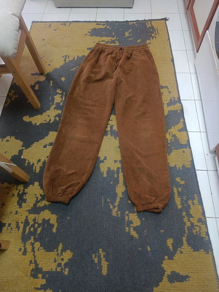 Kadınlar için kahverengi, bol kesim, midi boy ve lastikli paçalı, yumuşak keten kumaştan yapılmış rahat ve şık sokak tarzı pantolon. Günlük kullanım için uygundur.