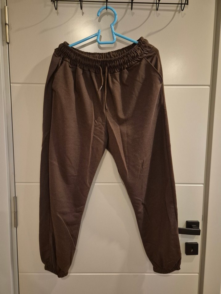 Yumuşak keten kumaştan, kahverengi bol kesim midi uzunlukta kadın eşofman. Lastikli bel ve günlük kullanım için rahat, zahmetsiz şıklık sunar. ️
