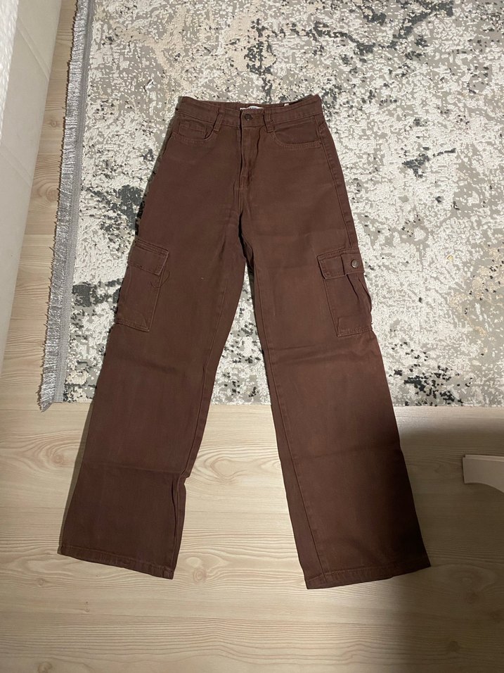 Pamuklu kumaştan, bol kesim ve midi boyda kahverengi kot pantolon. Sokak modasına uygun, cep detaylarıyla günlük rahat kullanım sağlar.