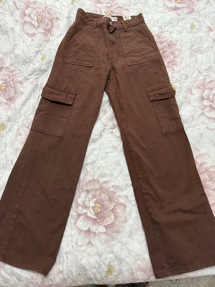 Düğmeli, kahverengi, bol kesim kadın kot pantolon. Pamuklu, midi boy ve bağcıklı ceplidir. Günlük kullanıma uygundur. ✨