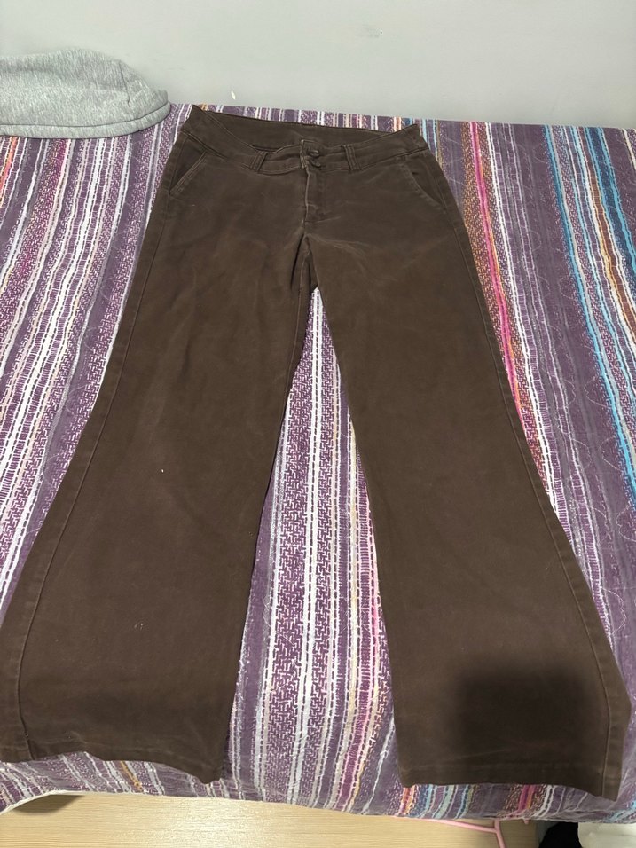 Bol kesim, kahverengi kot pantolon, midi boyda, rahat ve şık bir günlük sokak stili sunar. Vintage,düşük bel.