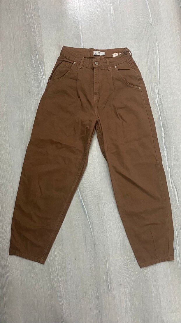 Pamuklu kumaştan yapılmış, kahverengi, bol kesim, normal midi uzunlukta kadın kot pantolon. Desensiz tasarımı ile rahat ve şık günlük kullanım için uygundur.