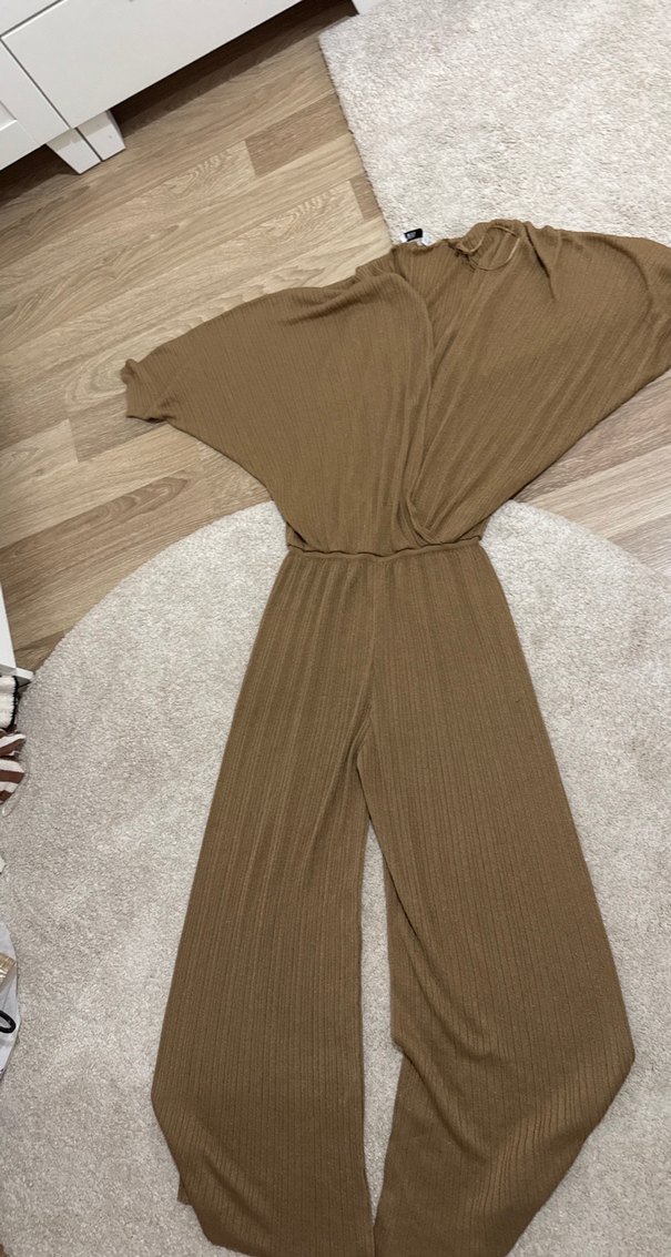 Kadın kahverengi uzun tulum, bol kesim, pileli detaylı, kısa kollu ve V yakalıdır. Yumuşak keten kumaştan yapılmıştır, rahat ve çağdaş bir tarza sahiptir.
