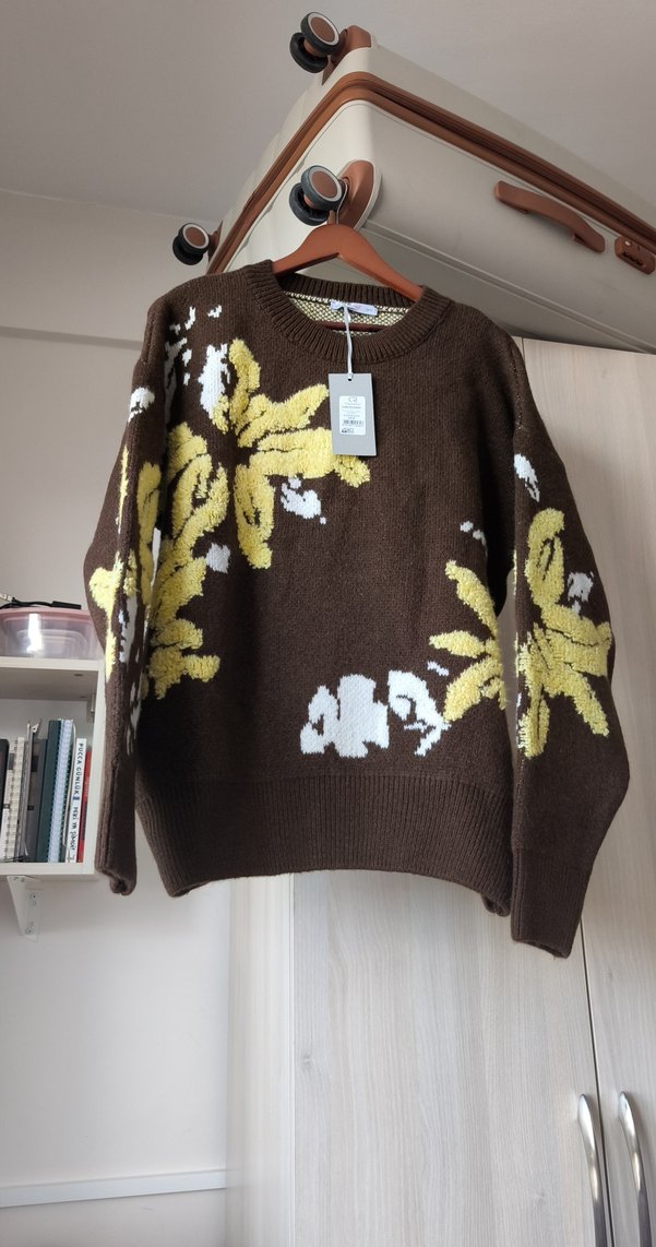 Kadın kahverengi örgü kazak, uzun kollu ve yuvarlak yaka. Sarı ve beyaz çiçek desenli, salaş kesim, günlük rahat sokak stili için uygundur.