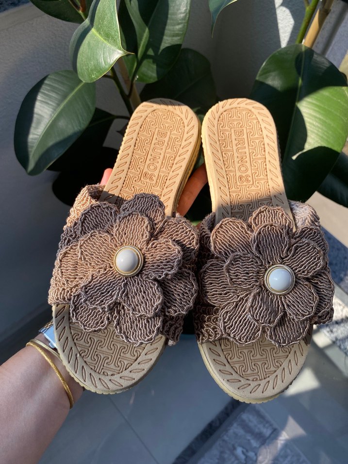 Kadın kahverengi örgü terlikler, dolgu topuk ve ortasında düğmeli büyük çiçekli dantel tasarıma sahiptir, günlük kullanım için uygundur.