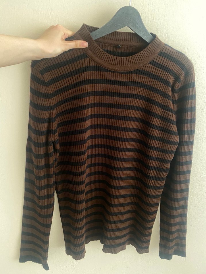 Kadınlar için balıkçı yaka, uzun kollu, kahverengi çizgili örme kazak. Rahat ve normcore tarzıyla günlük kullanıma uygundur.