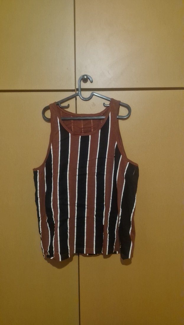 Kahverengi, dikey çizgili ve pileli dokulu kolsuz bluz, rahat kesimiyle günlük kullanıma uygundur.