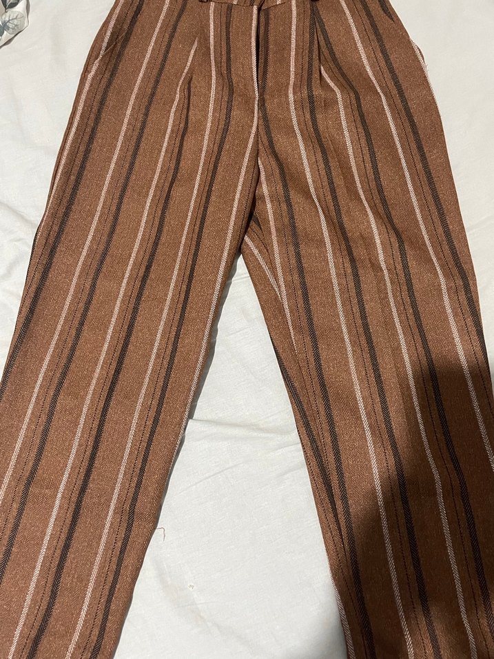 Fotoğraftakinden daha canlı rengi ışıktan dolayı kötü çıkıyor. Kahverengi çizgili, pile detaylı, midi boy, normal kesim kumaş pantolon. Sentetik kumaştan, rahat ve şık sokak stili için uygundur.