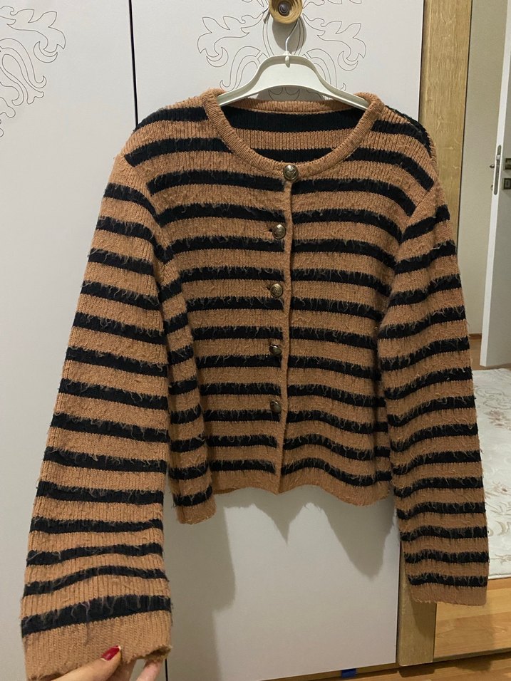 Kadınlar için uzun kollu, yuvarlak yakalı ve bol kesim kahverengi siyah çizgili örgü hırka. Rahat ve gündelik kullanıma uygundur.