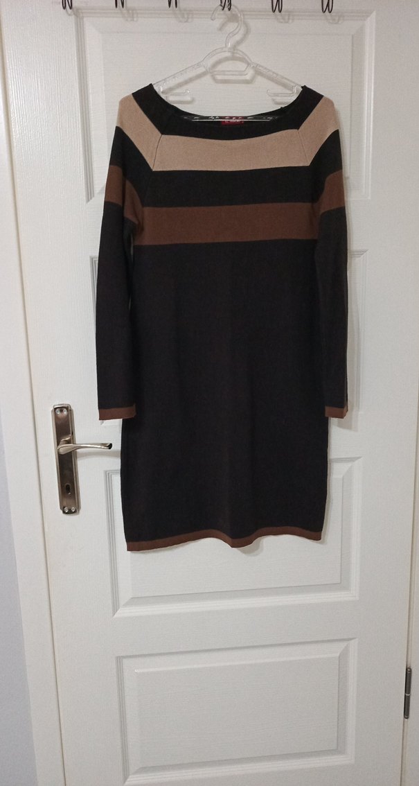 Uzun kollu, kayık yaka ve çizgili desenli, yün triko kumaştan yapılmış, vücuda oturan kahverengi elbise. Rahat günlük kullanım için uygundur.