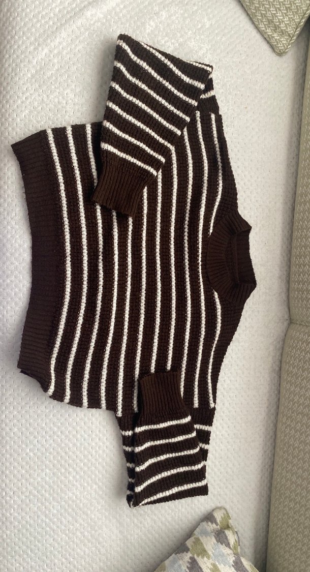 Kadınlar için uzun kollu, salaş kesim ve tekne yakalı kahverengi-beyaz çizgili yumuşak triko kazak. Rahat ve günlük kullanım için uygundur.