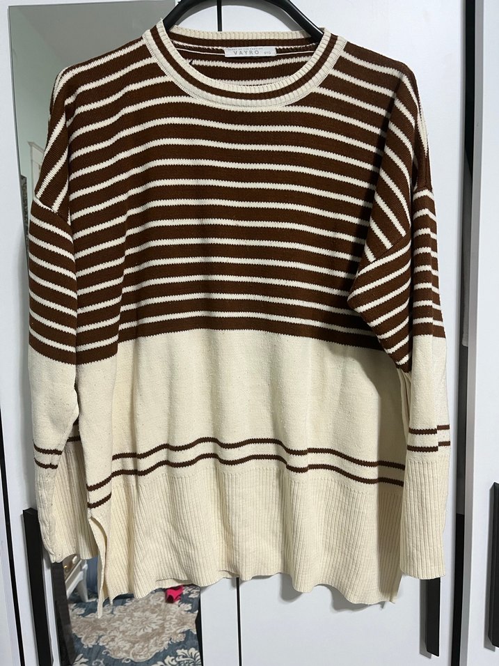 Kadınlar için uzun kollu, yuvarlak yakalı ve yumuşak triko kumaştan kahverengi ve krem çizgili bol kesim kazak. Rahat ve günlük tarz için uygundur.