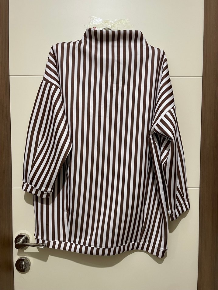 Kadınlar için uzun kollu, kayık yaka ve pile detaylı kahverengi çizgili bluz. Rahat kesim, sentetik kumaştan, günlük sokak stili için uygun. Scuba hiç giymedim