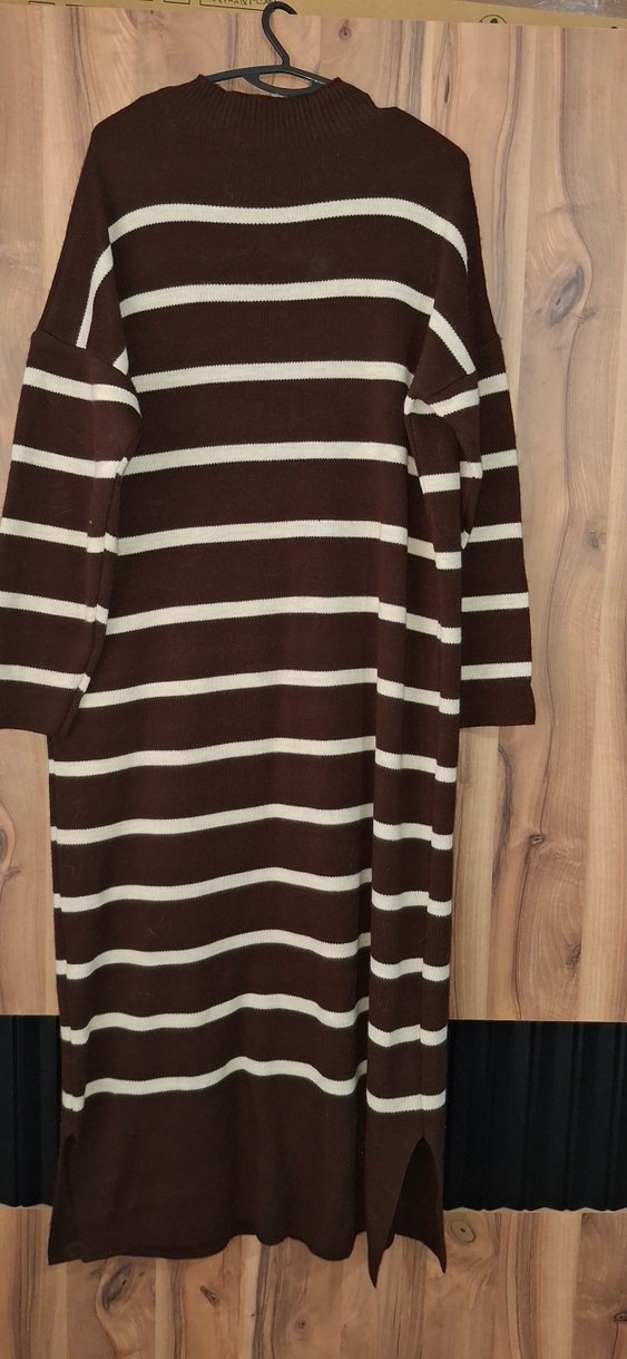 Uzun, bol kesim triko elbise, kayık yaka ve uzun kollu, kahverengi ve krem çizgili, yumuşak sentetik kumaştan rahat bir dokunuş sunar.