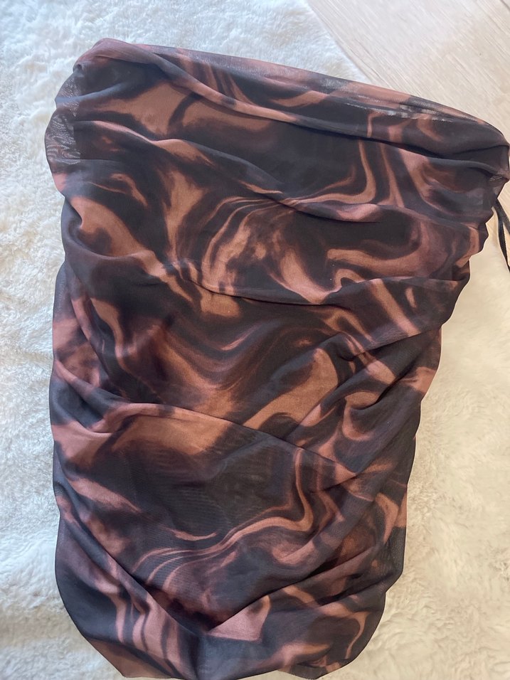 Kadınlar için kahverengi, saten dokulu, drapeli şal, çağdaş ve rahat bir tarz sunar.