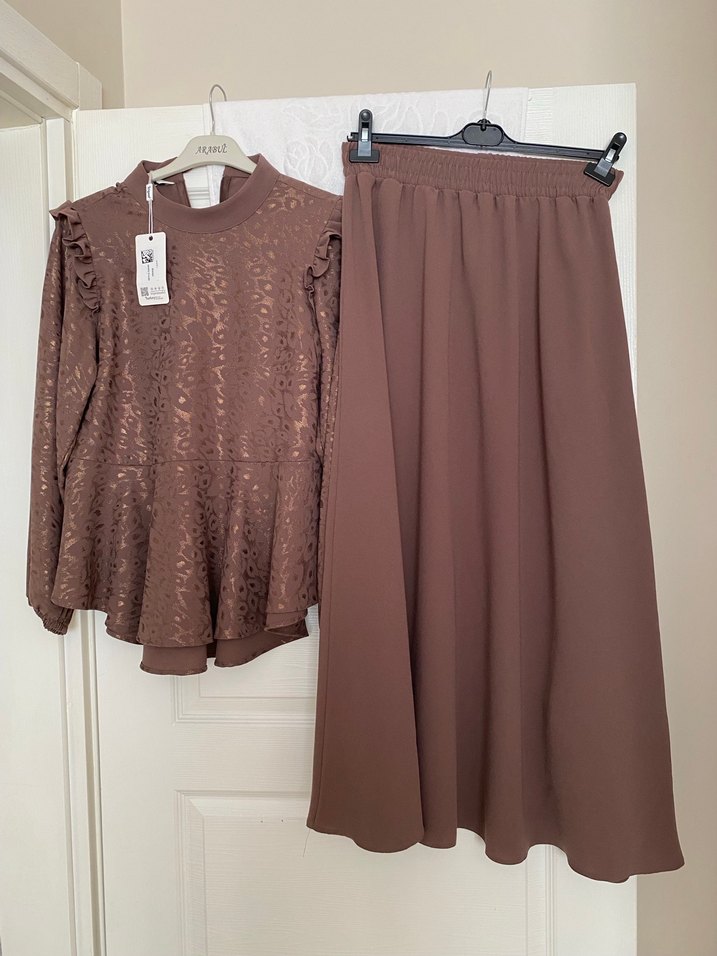 Kadınlar için uzun, bol kesim kahverengi etek takım , dantel detaylı ve yumuşak sentetik kumaştan, günlük kullanım için uygundur. (Marka temsili ona ait değil ) fiyat için mesaj atın öne çıksın diye koydum b