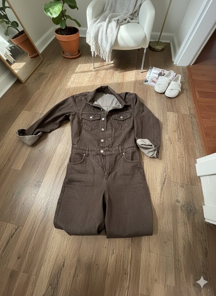 Kahverengi denim kumaştan, uzun kollu ve yaka kısmı açık yakalı, düğmeli ön kısmı olan günlük kullanıma uygun rahat kesim tulum.