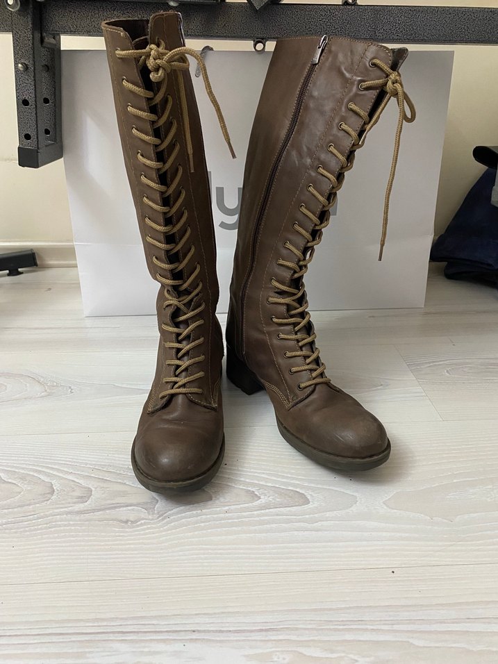Kahverengi deri, önü bağcıklı ve yan fermuarlı çizme. Son görselde belirttiğim gibi iç etiket kısmında hafif soyulma mevcut.