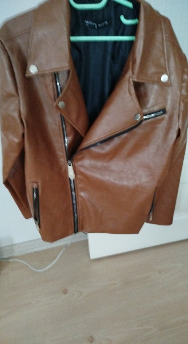 Kahverengi deri biker ceket, çıtçıtlı yakalı ve fermuarlı detaylara sahip. Normal kesim ve askılı kollu, sokak stiline uygun.