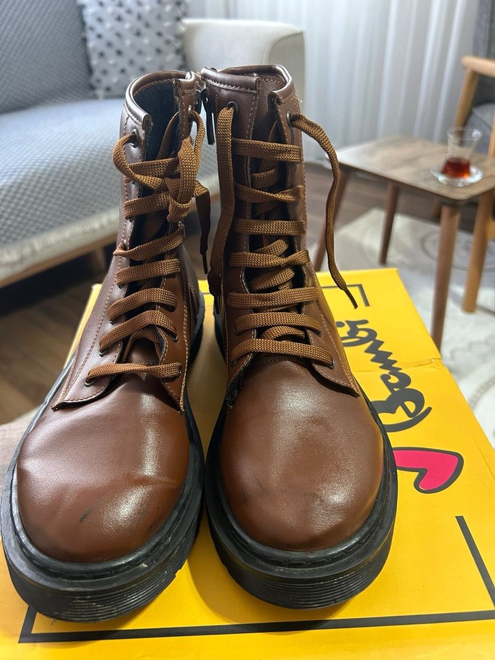 Kahverengi deri kadın botları, blok topuklu ve tokalı, günlük sokak stiline uygun.