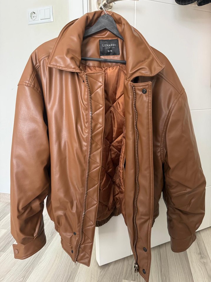 Parlak kahverengi deri ceket, çıtçıtlı yaka ve fermuarlı ön kısmıyla dikkat çeker. Uzun kollu, rahat kesim ve midi boyda, günlük sokak stili için uygun.