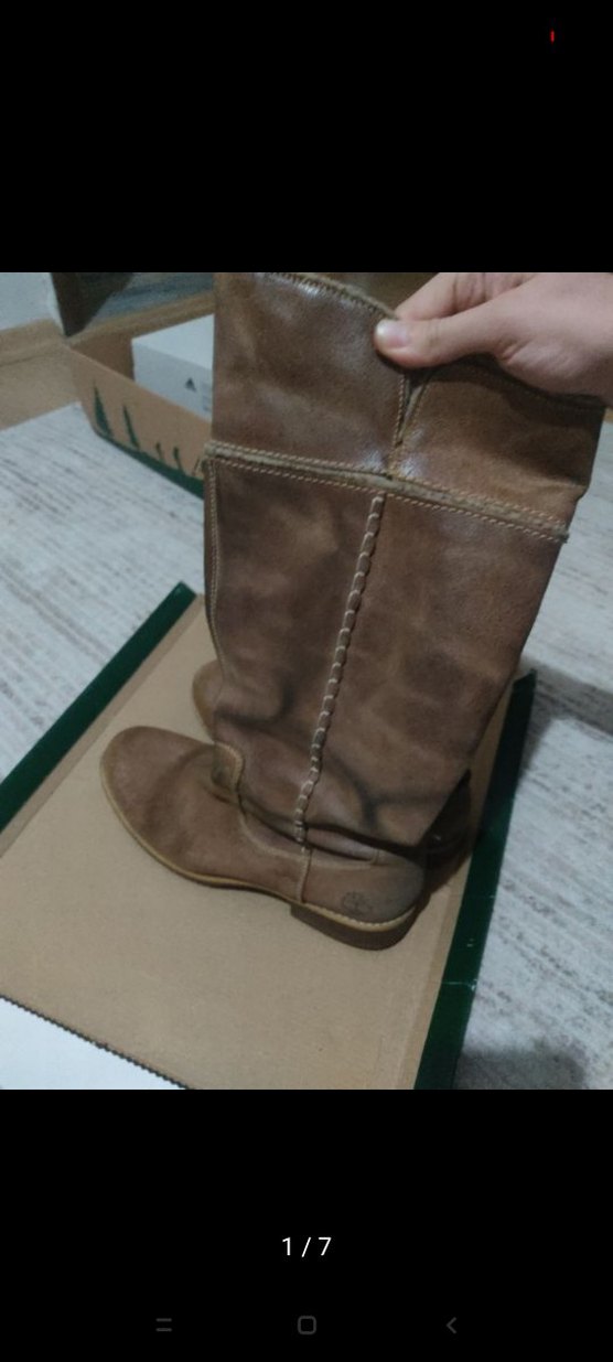 Süettir sağ ayakkabının dış kısmında dikiş var 4. resimde detaylı çektim. Kullanılmış bir üründür o nedenle teklife açıktır. Kahverengi deri kadın diz boyu çizme, dolgu topuklu ve tokalı detaylara sahip, rahat bohem tarzda. Günlük kullanım için uygundur.