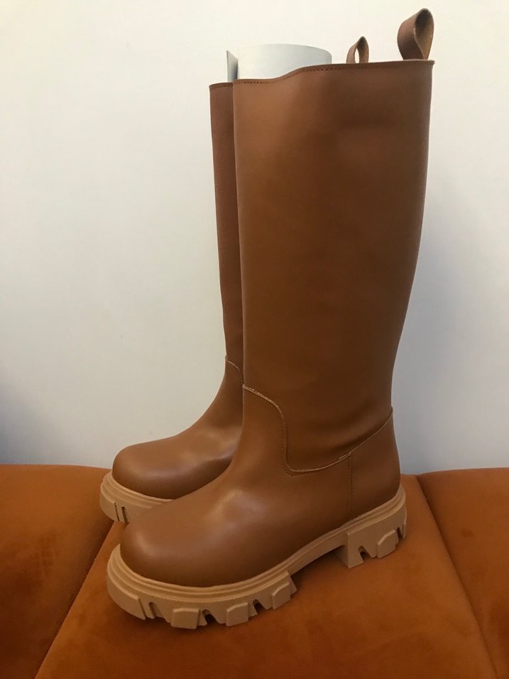 Kadınlar için dizüstü, koyu kahverengi deri platform topuklu çizme. Sokak tarzında rahat ve şık görünüm sunar.