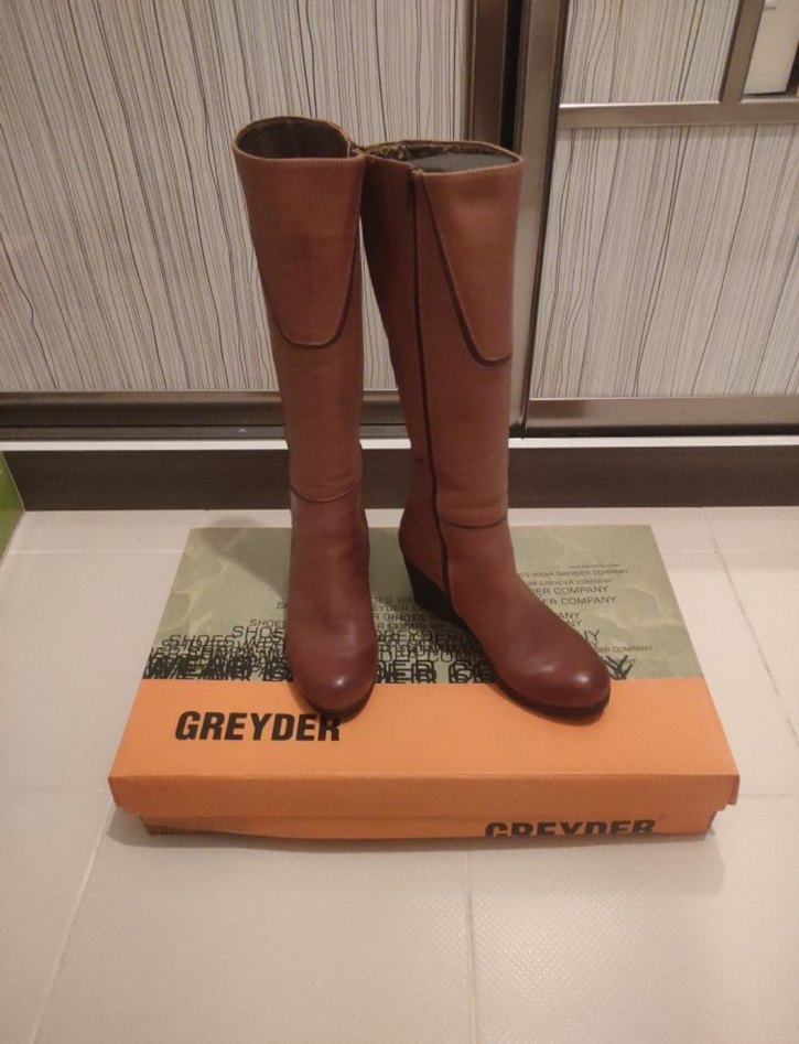 Kahverengi deri, dolgu topuklu, kemerli diz boyu kadın çizmesi. GREYDER markası, rahat ve şık bir görünüm sunar. 38 numara,yumuşak ve rahat orijinal deriden üretilmiştir.
