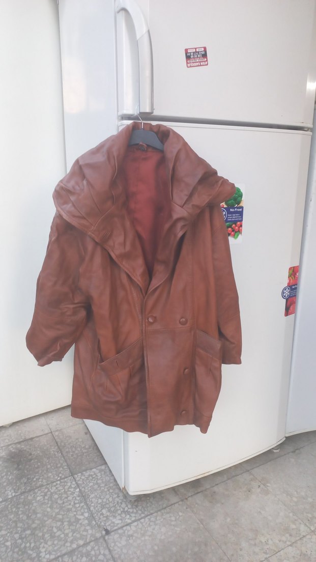 Kadın kahverengi deri ceket, düğmeli ön ve kesik yaka detayına sahiptir. Salaş kesim, uzun kollu ve midi boydadır. Sokak stiline uygun, desensiz ve koyu renklidir. #erkek de giyer unixes boya gerekir s beden ama owirsize