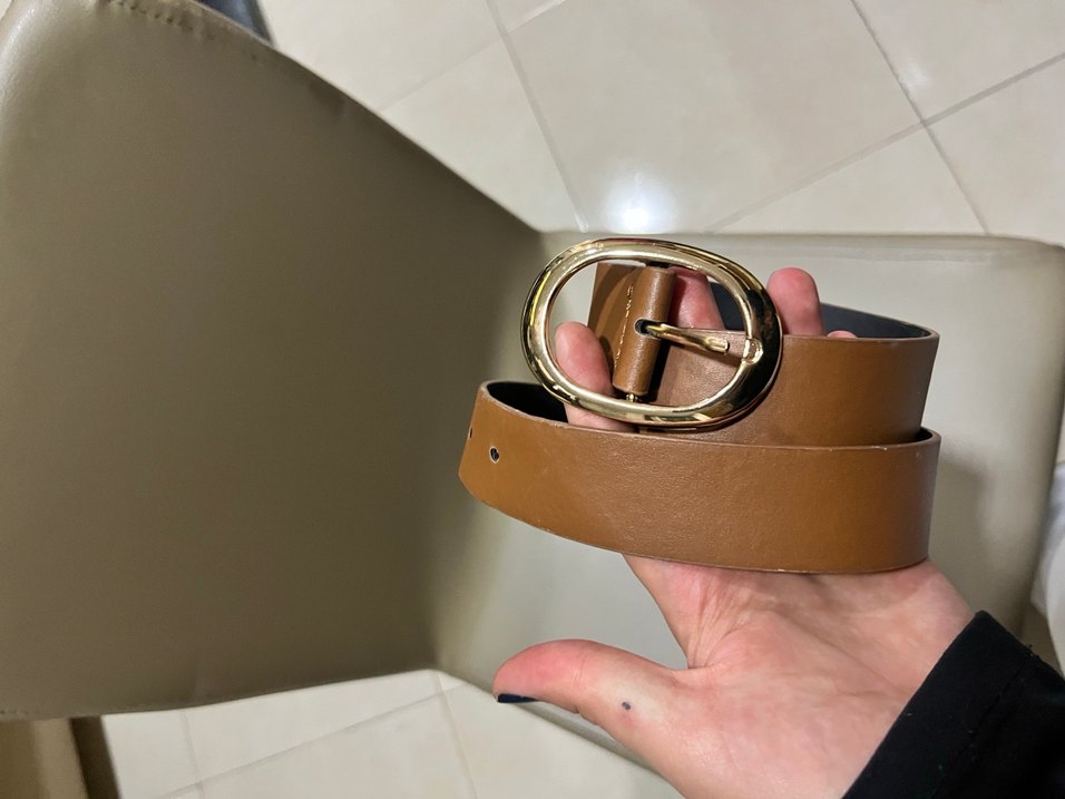 Kadınlar için açık kahverengi deri kemer, altın tonlu tokasıyla minimalist ve çağdaş bir tasarım sunar. Sade ve temel tarzlar için uygundur.