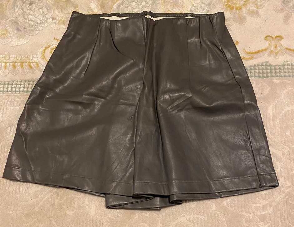 Kahverengi deri, kemerli, bol kesim kadın midi şort. Sokak modasına uygun, rahat ve şık bir parça.