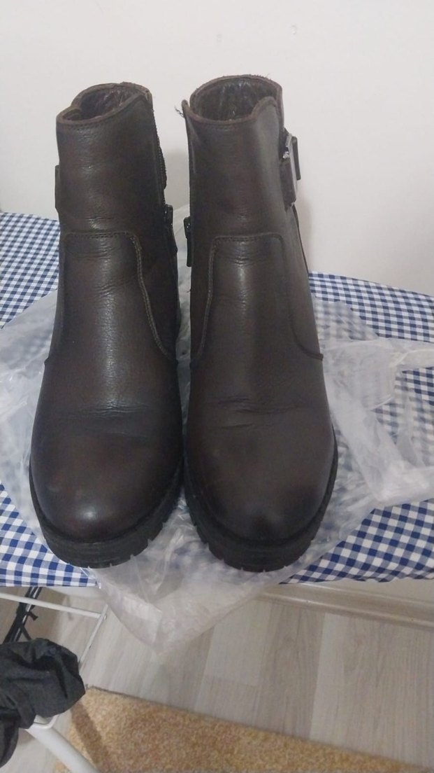 Kadınlar için kahverengi deri, tokalı ve topuklu botlar. Günlük kullanıma uygun klasik tarzda, koyu renkli.