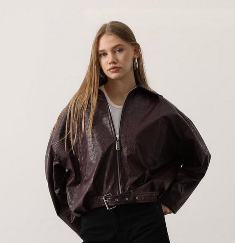 Bu kadın kahverengi deri ceket, yılan deseni, yüksek yaka ve kemerli bel detayına sahiptir. Salaş kesim, uzun kollu ve midi boydadır. Marcelys marka