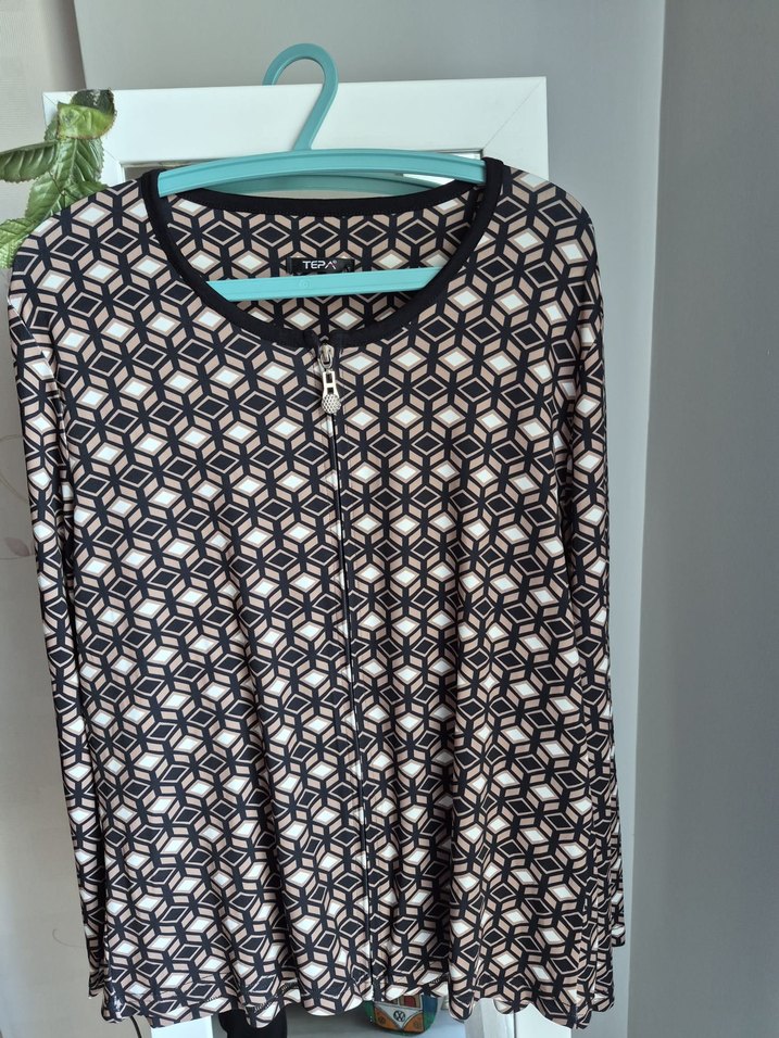 Kadın kahverengi geometrik desenli, uzun kollu, yuvarlak yaka ve fermuarlı bluz. Midi boy, bol kesim ve sentetik dokulu kumaş ile günlük kullanıma uygun.