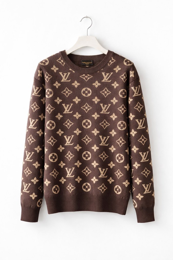 Kadınlar için uzun kollu, yuvarlak yaka, bol kesim kahverengi desenli triko kazak. Yumuşak dokulu, günlük rahat stil için uygundur.