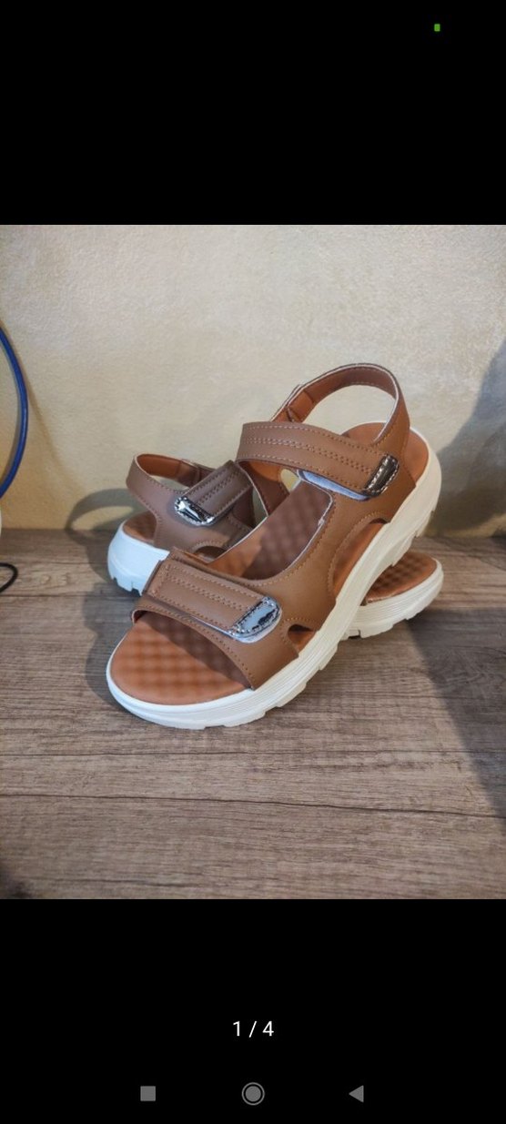 Kadınlar için açık kahverengi, dolgu topuklu ve tokalı sandaletler. Kauçuk malzemeden üretilmiş, günlük sokak stili için uygun rahat ve şık tasarım. 39 numara. Ürün hiç kullanılmadı #sandalet #ayakkabı