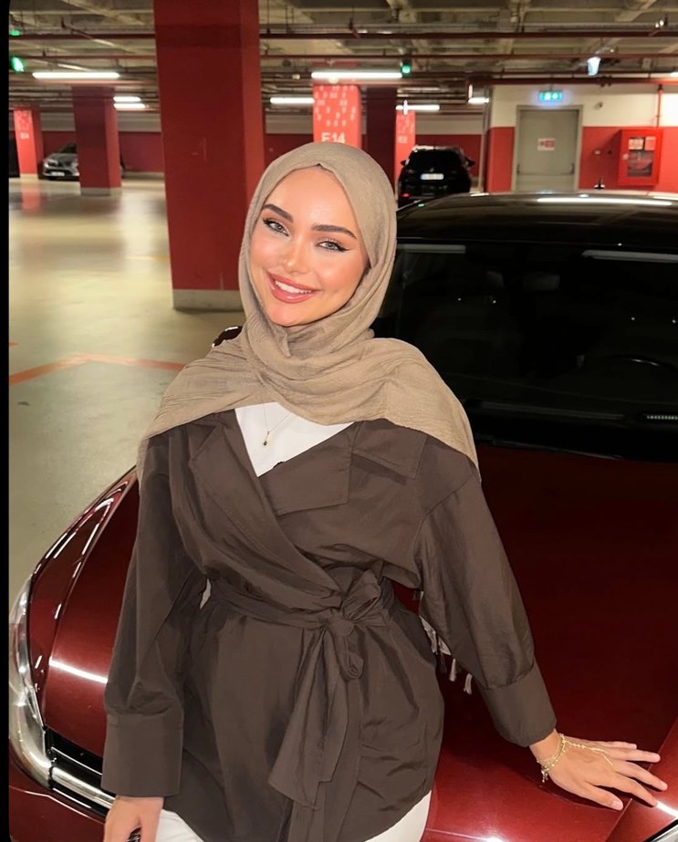 Kadın kahverengi drapeli, dokulu, kuşaklı ceket. Sokak stiline uygun, modest tarzda rahat bir kullanım sunar.