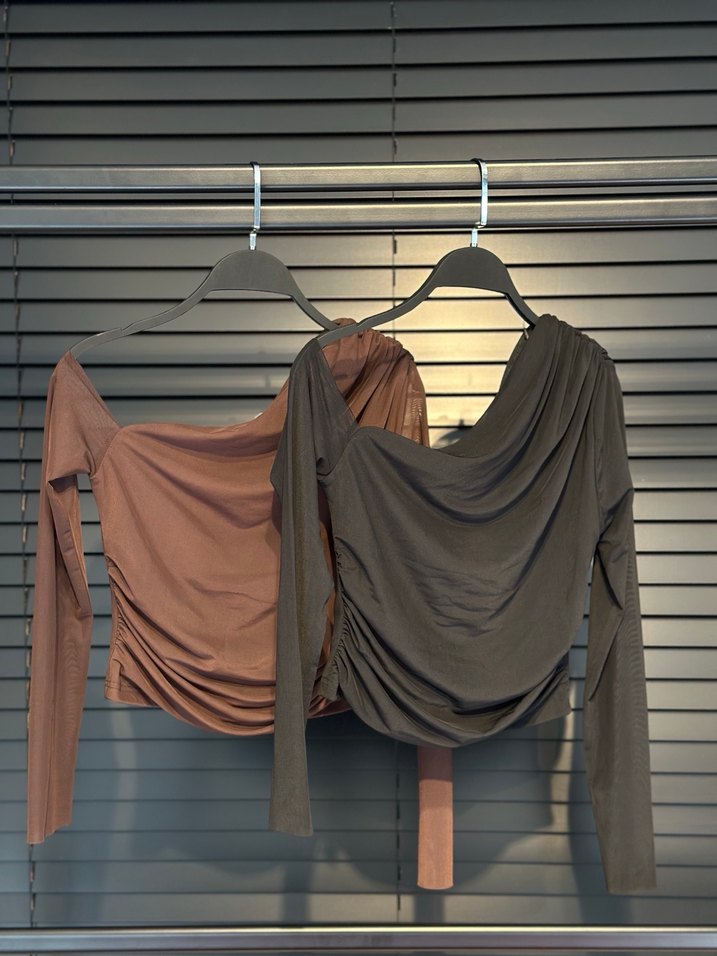 Kadınlar için kahverengi ve siyah, drapeli ve omuz dekolteli uzun kollu, fit kesim tül bluz. Günlük kullanıma uygun modern ve desen içermeyen normal boyda. S-M-L bedenlidir.