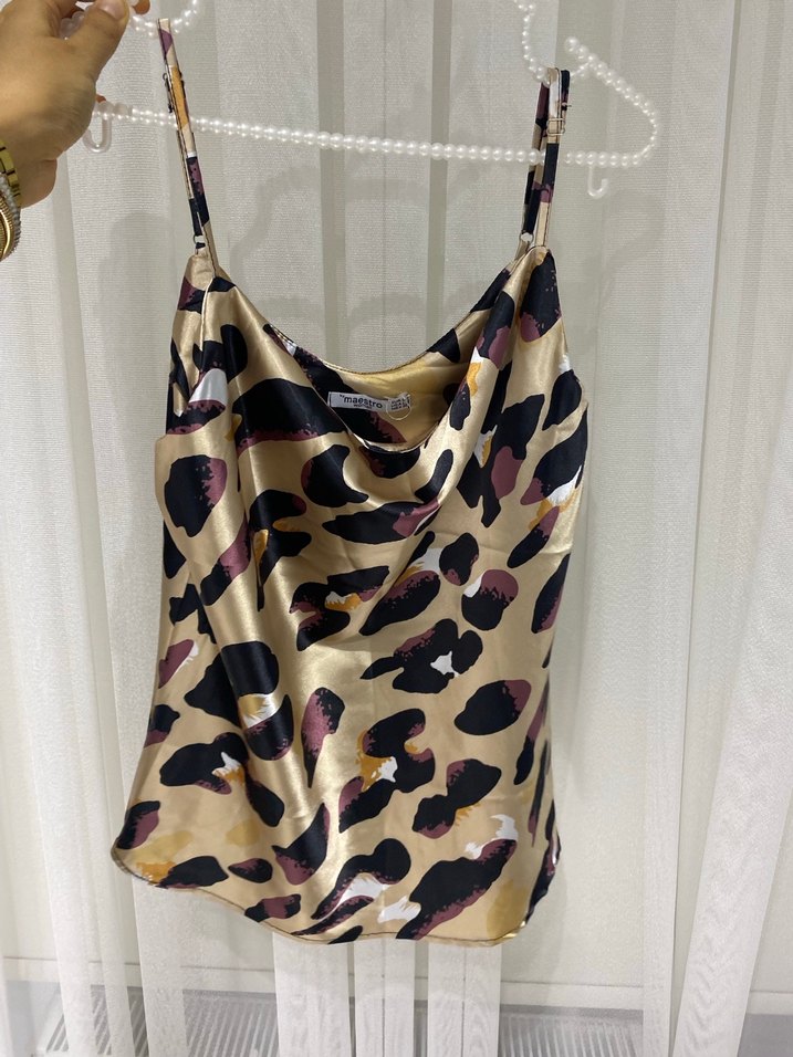 Kadın kahverengi, drapeli V yaka, orta uzunlukta, salaş kesim, sentetik kumaştan yapılmış, koyu renkli tie-dye desenli saten atlet.