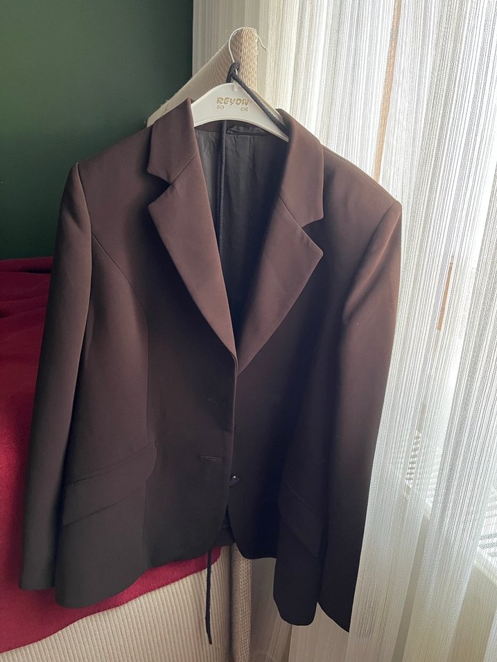 Kadın kahverengi blazer, kesik yaka, uzun kollu ve düğmeli. İpeksi dokulu, midi boyda ve klasik ofis tarzına uygun.