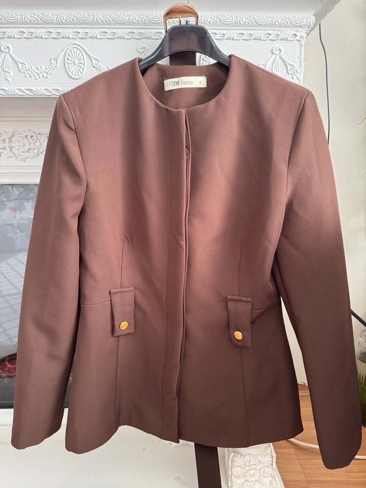 Kahverengi, ipeksi dokulu, düğmeli, normal uzunlukta, klasik kesim kadın blazer. Ofis kullanımı için uygundur. ✨
