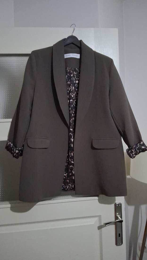 Kahverengi, düğmeli kadın blazer ceket, keskin yaka ve uzun kolludur. Orta uzunlukta, düz tasarımlı ve ofis için uygundur. Trendy casual tarzı tamamlar.